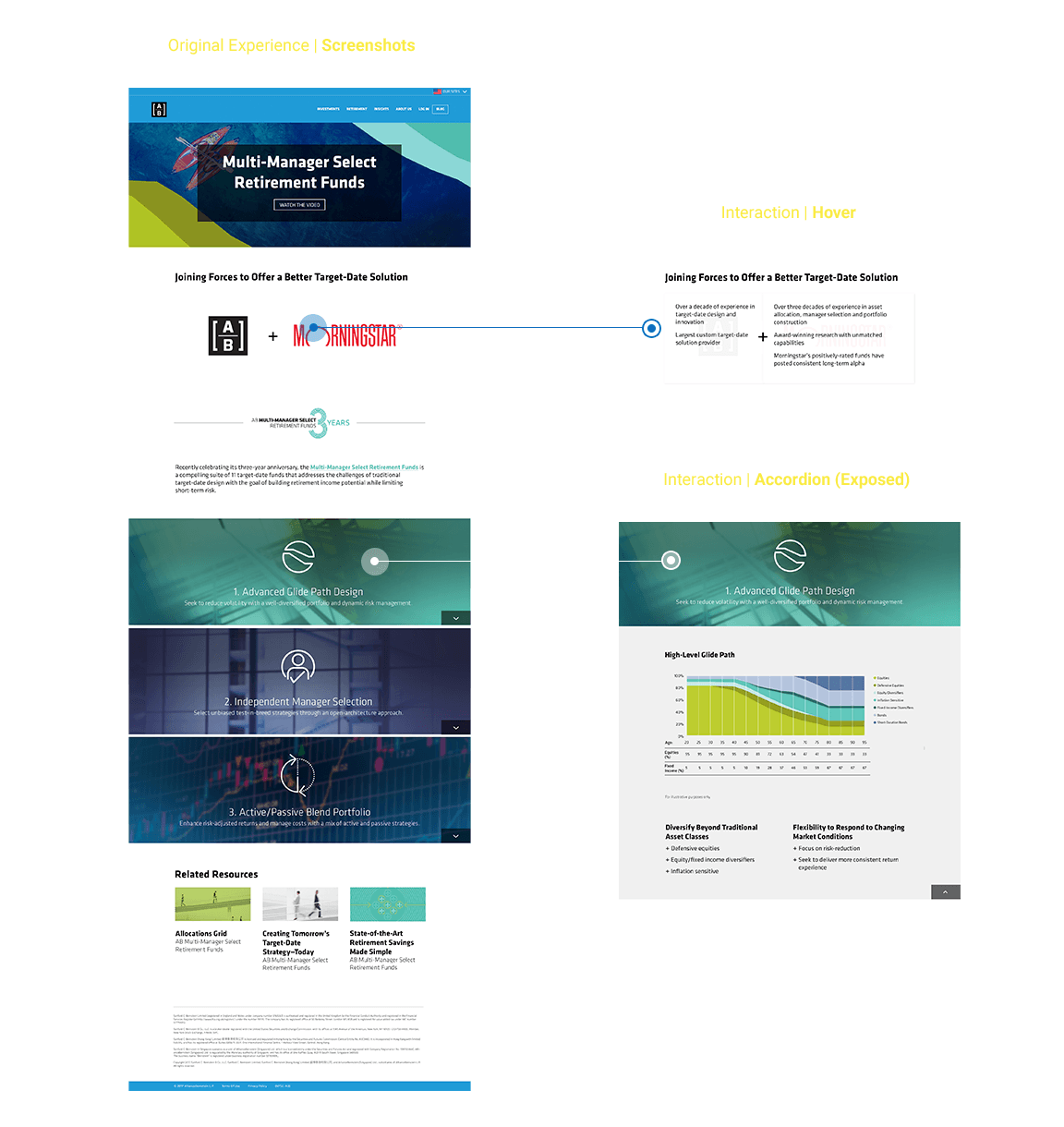 The first step of my process was working with the VP of UX to assess which layout, hierarchy and interactions were in need of improvement. The previous experience hadn't been designed by a digital-first designer. In the original experience, a bulk of pertinent content was hidden behind a hover-states and accordions, which prevented the users from quick scrolling in order to skim content (bc it required an additional step of the user each block of content).