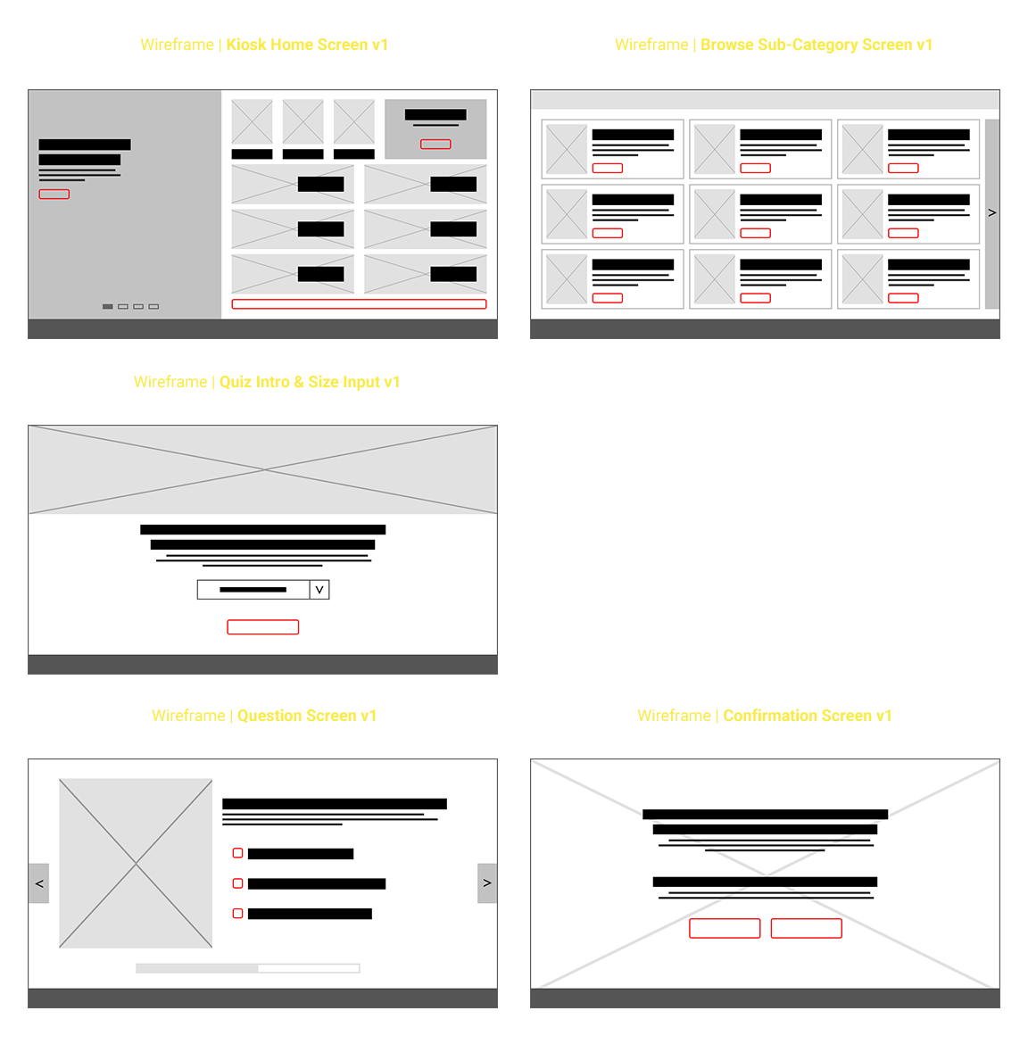 The UX Manager for in-store technology provided an early wireframe as a starting point. While helpful as a foundation, it was fairly bare-bones and created before final content had been developed. Key components—particularly the educational elements around fit—were missing, which meant we needed to evolve the layout significantly to support the experience we envisioned.