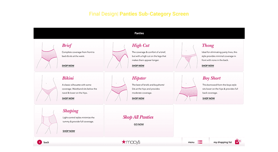 Once the final wireframes were approved, the next step was to visually design each screen—mapping out categories, product types, and common fit issues. I was able to leverage existing imagery from Macy’s print campaigns to reflect the brand’s aesthetic and showcase real merchandise wherever possible.